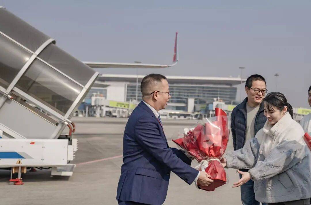 图:湖南航空常务副总裁和志辉为接机机组献花